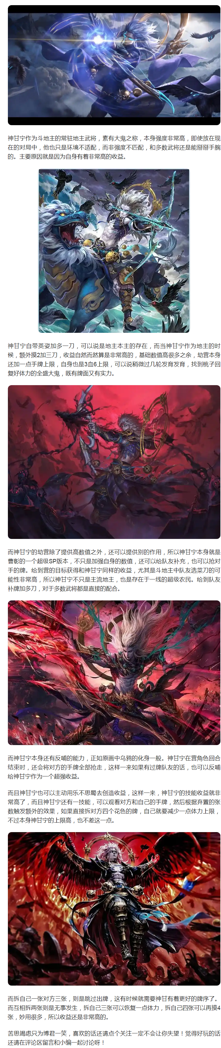 在三国杀的对局中,风林火山阴雷包可以说是远古版本的产物,基本上每一个武将都耳熟能详,比现在多数出的武将而言,那个年代的武将每一个玩家都非常熟悉。而在其中神将的设计之中,真正能代表收官之作的,不是之前翻新加强的神司马懿,而是雷包最具牌面的神甘宁。