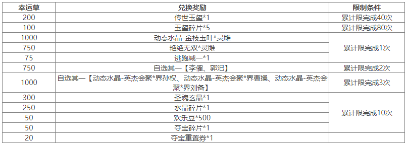1、幸运草可兑换奖励,若兑换奖励是在此次活动前已拥有的永久武将、皮肤、三国秀,则无法重复兑换;