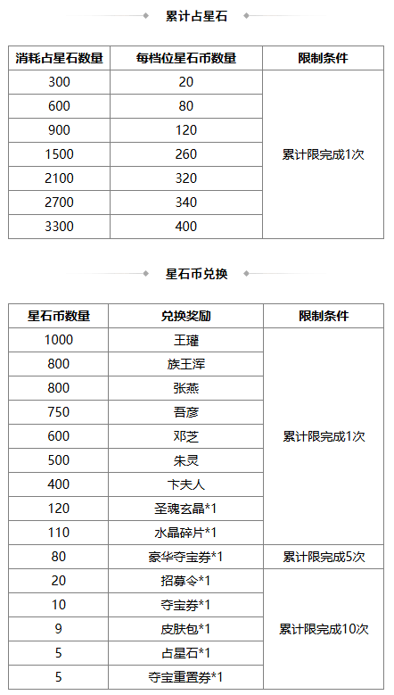 4、若玩家在占星活动过程中,通过其他途径获得已选珍贵道具(永久武将),则在珍贵库中重选奖励,之前获得的占星次数不清零;