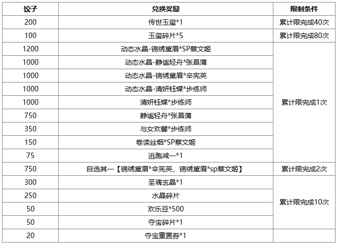 1、饺子可兑换奖励,若兑换奖励是在此次活动前已拥有的永久武将、皮肤、三国秀,则无法重复兑换;