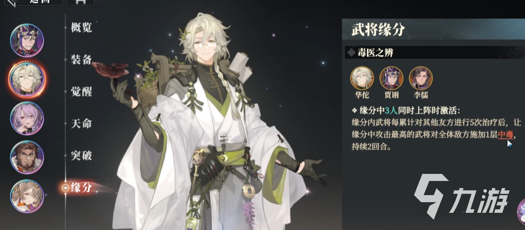 根据该武将的缘分效果,他适合与贾诩,李儒组队,他们三个组合之下,缘分内武将每累计对其他友方进行5次治疗后,让缘分中攻击力最高的武将,对全体敌方施加1层中毒。