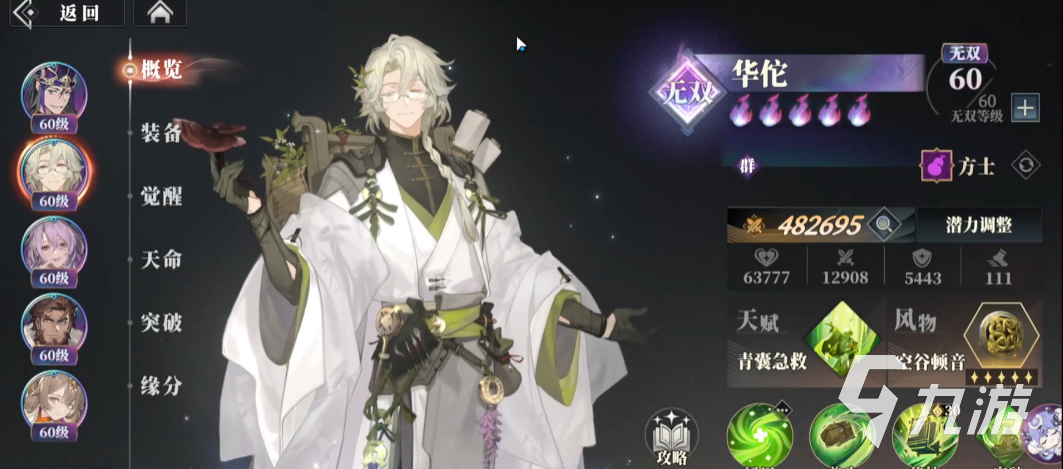 天赋“青囊急救”,主动施加治疗效果后,为目标友军施加1层持续2回合的“青囊”,每层提升15%受愈率,被主动攻击后消耗1层,治疗施加者50%的血量,3层上限,能被驱散;2级触发青囊时,额外驱散1个减益;3级在战斗开始时,就能给全体友方施加2层青囊。