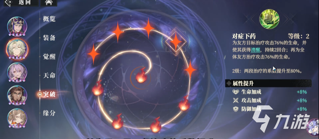 绝技“对症下药”,为友方目标治疗攻击力75%的血量,并使其获得2轮”清醒”效果,再给全体友方施加治疗,75%基于攻击力的治疗效果;2级时2段治疗系数都提升到80%,3级时2段治疗系数提高到83%。