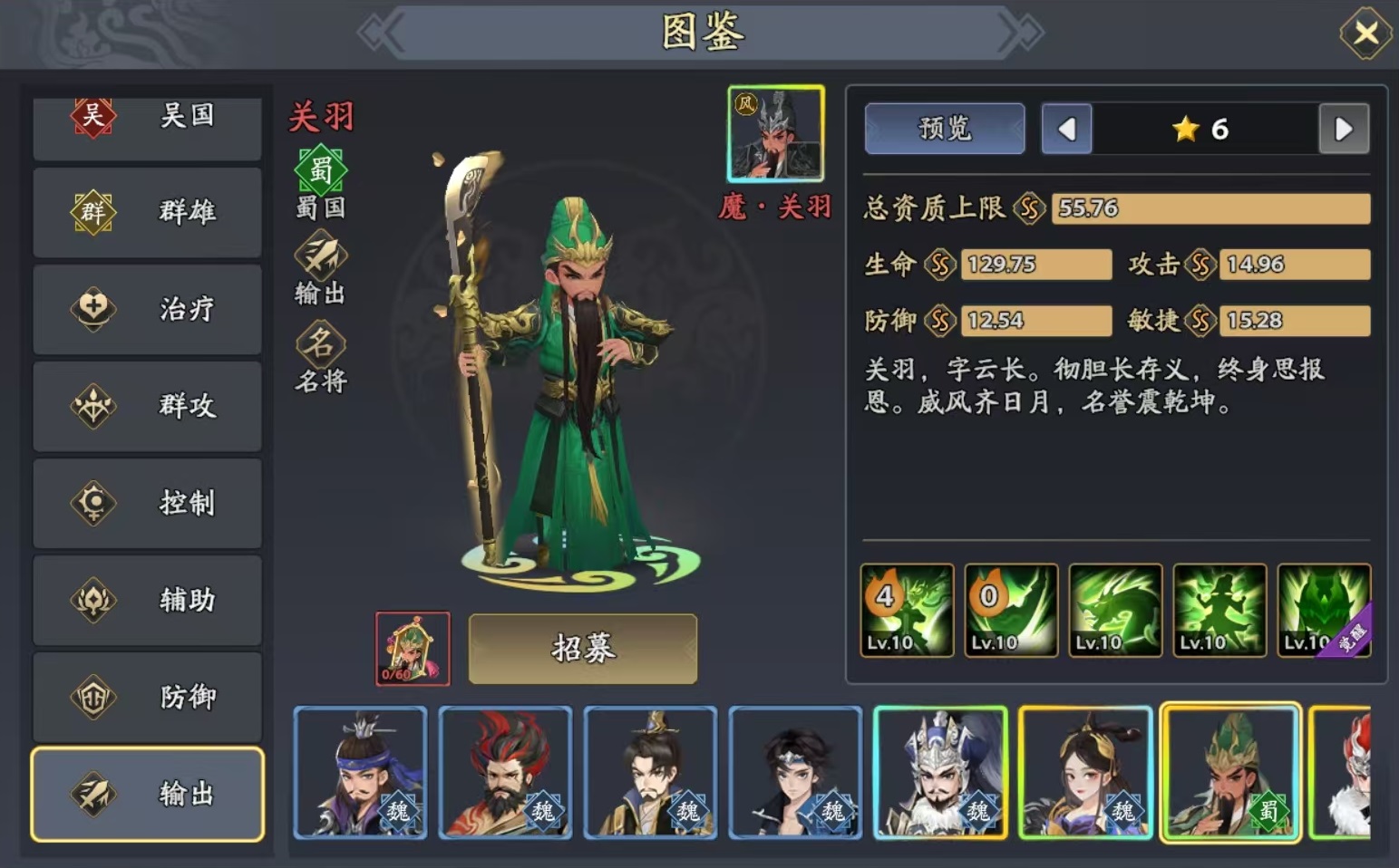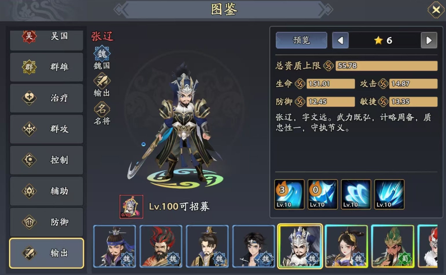 首先是在输出方面,小编认为目前最值得选择的是吕布、董卓、关羽和张辽这4个。张辽对于敌方单体目标有着很强的输出能力,还可以根据伤害比例恢复生命值,并有额外的暴击几率和对目标造成惊吓等。关羽可为自身添加武圣状态,对于单个目标有额外效果,且能附加命中和暴击,武圣对于伤害加成、吸血提升和无视反震方面的属性,使得关羽非常适合用来切对方的单体目标。