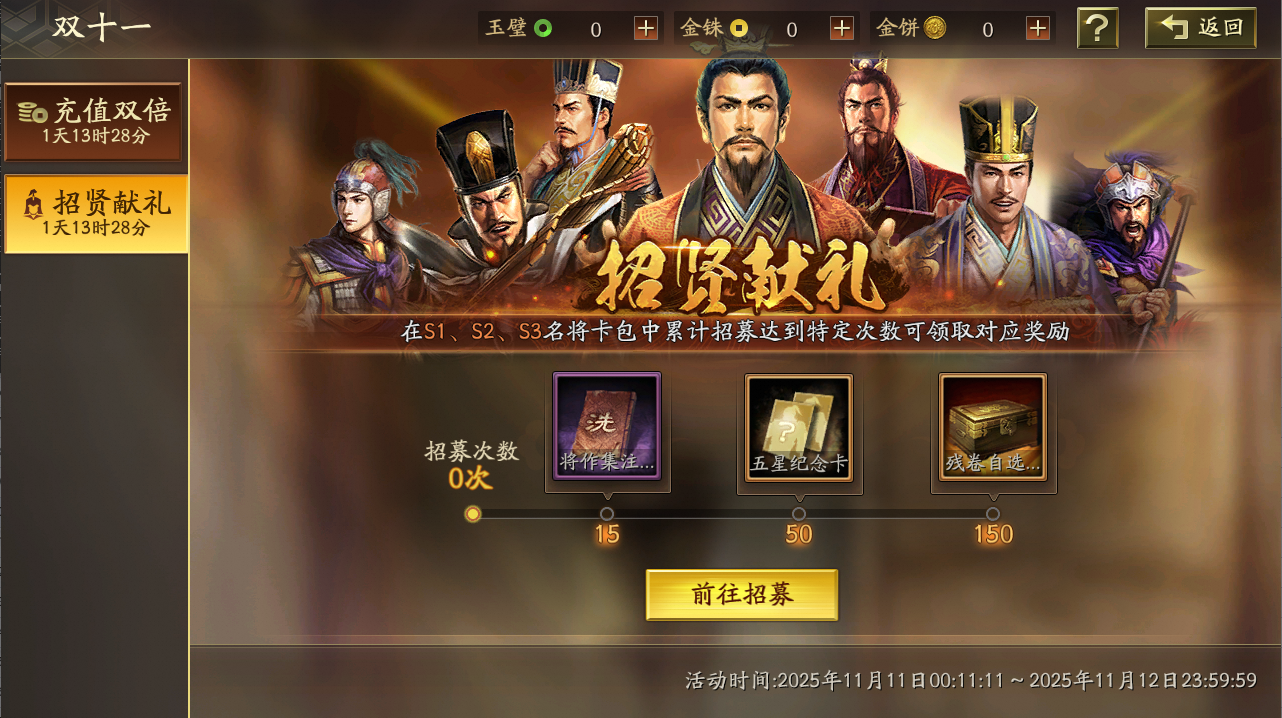 活动期间,主公在S1、S2、S3三个赛季名将卡包中累计招募次数分别达到15、50、150次后可对应领取到将作集注·洗练、五星纪念卡、残卷自选锦盒奖励(其中S赛季的主公仅可选择将作残卷)。