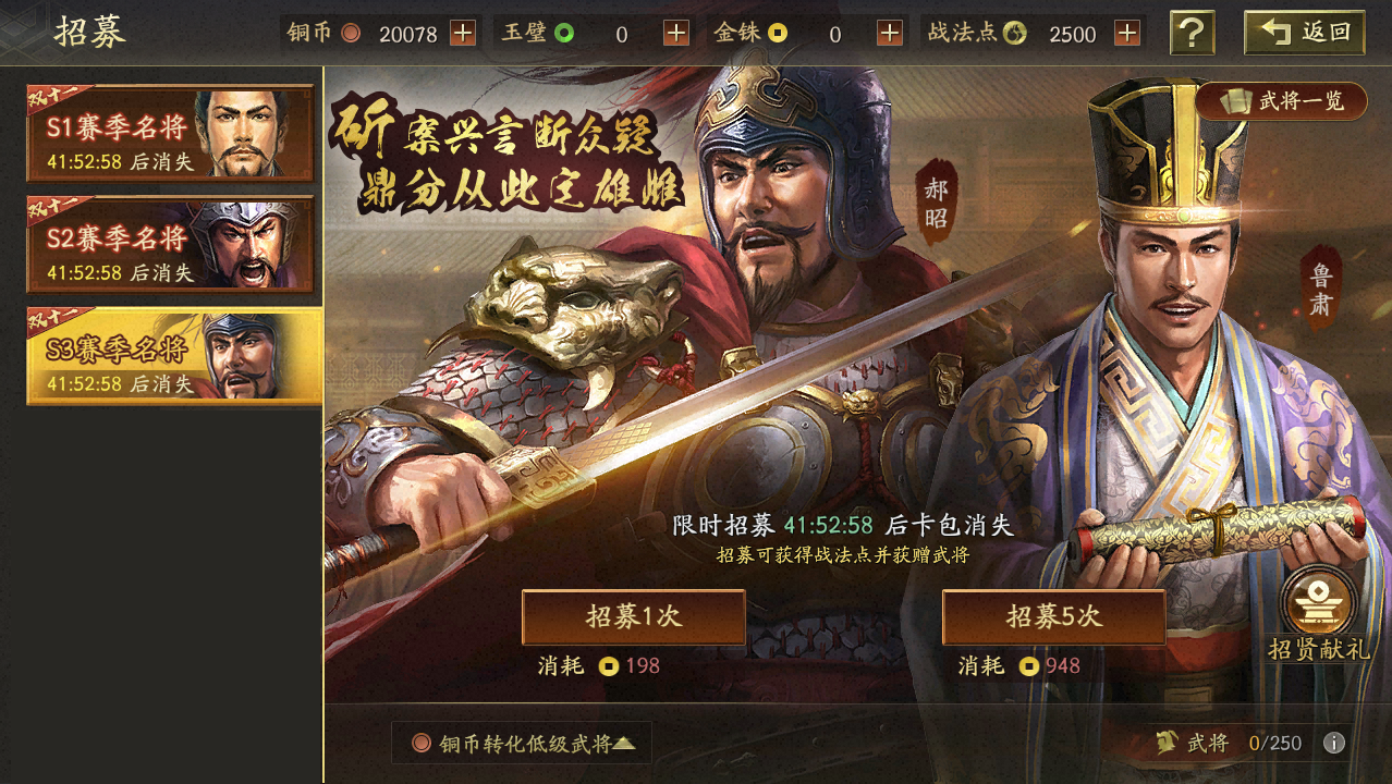 活动期间,S2及之后的赛季服务器将会限时开启S2与S3赛季名将卡包。各位主公可按需通过消耗金铢获得战法点与心仪的武将。