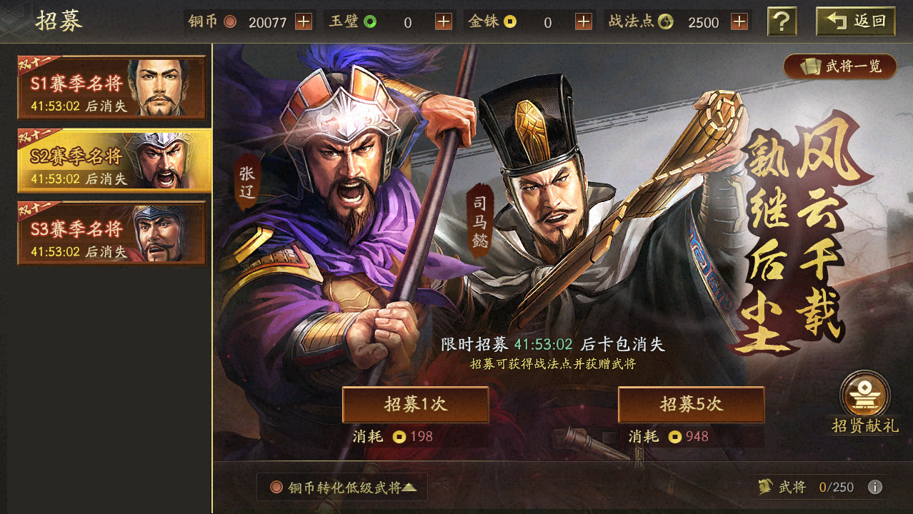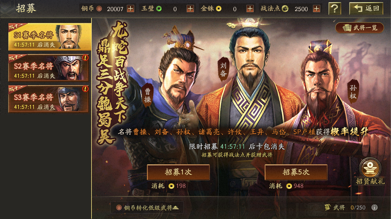 活动期间,全赛季将限时开启S1赛季名将卡包,该卡包可招募的五星名将数量为40名,其中曹操、刘备、孙权、诸葛亮、许攸、王异、马岱、SP卢植获得概率提升。各位主公可按需通过消耗金铢获得战法点与心仪的武将。