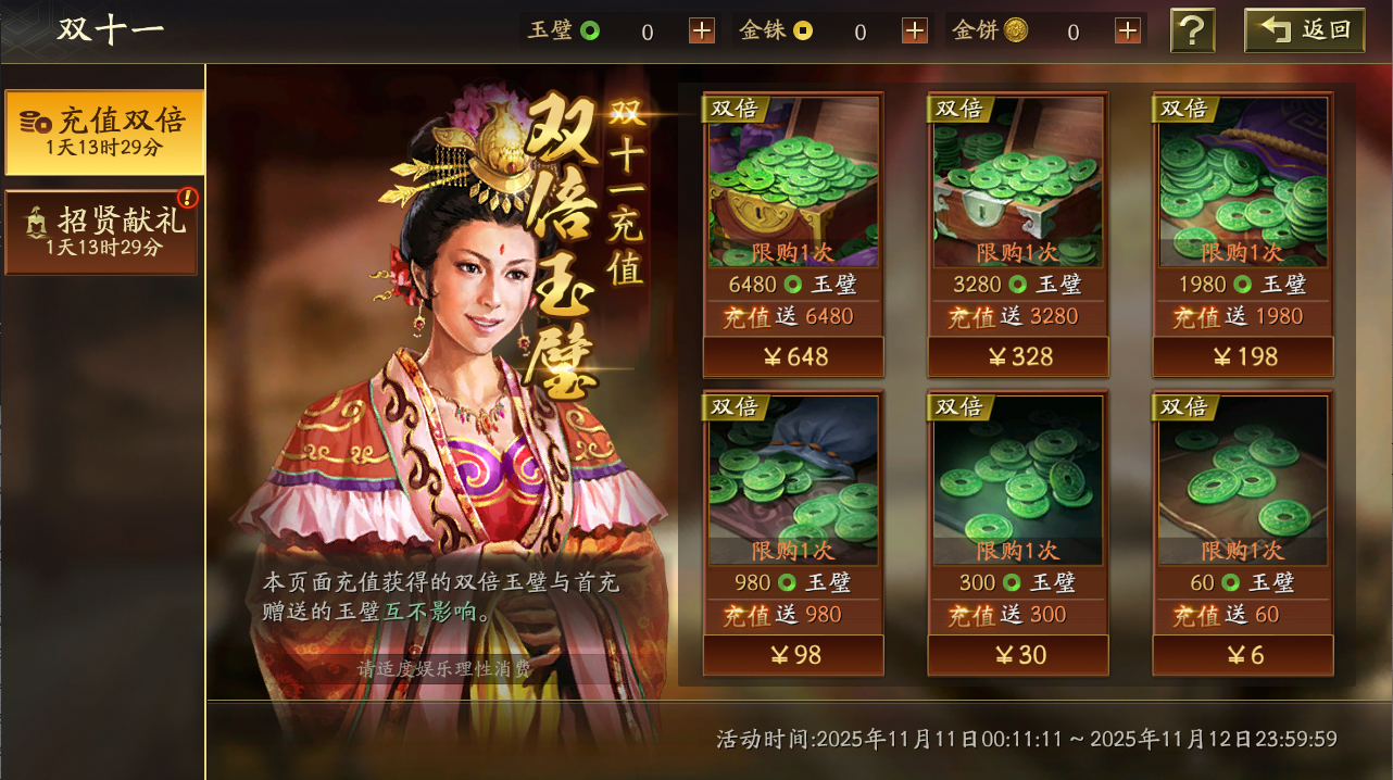 活动期间,主公可在游戏内活动界面中充值获得双倍玉璧,各档位玉璧均可充值一次。本活动内充值获得的玉璧与游戏内充值界面内的首充赠送玉璧互不影响。