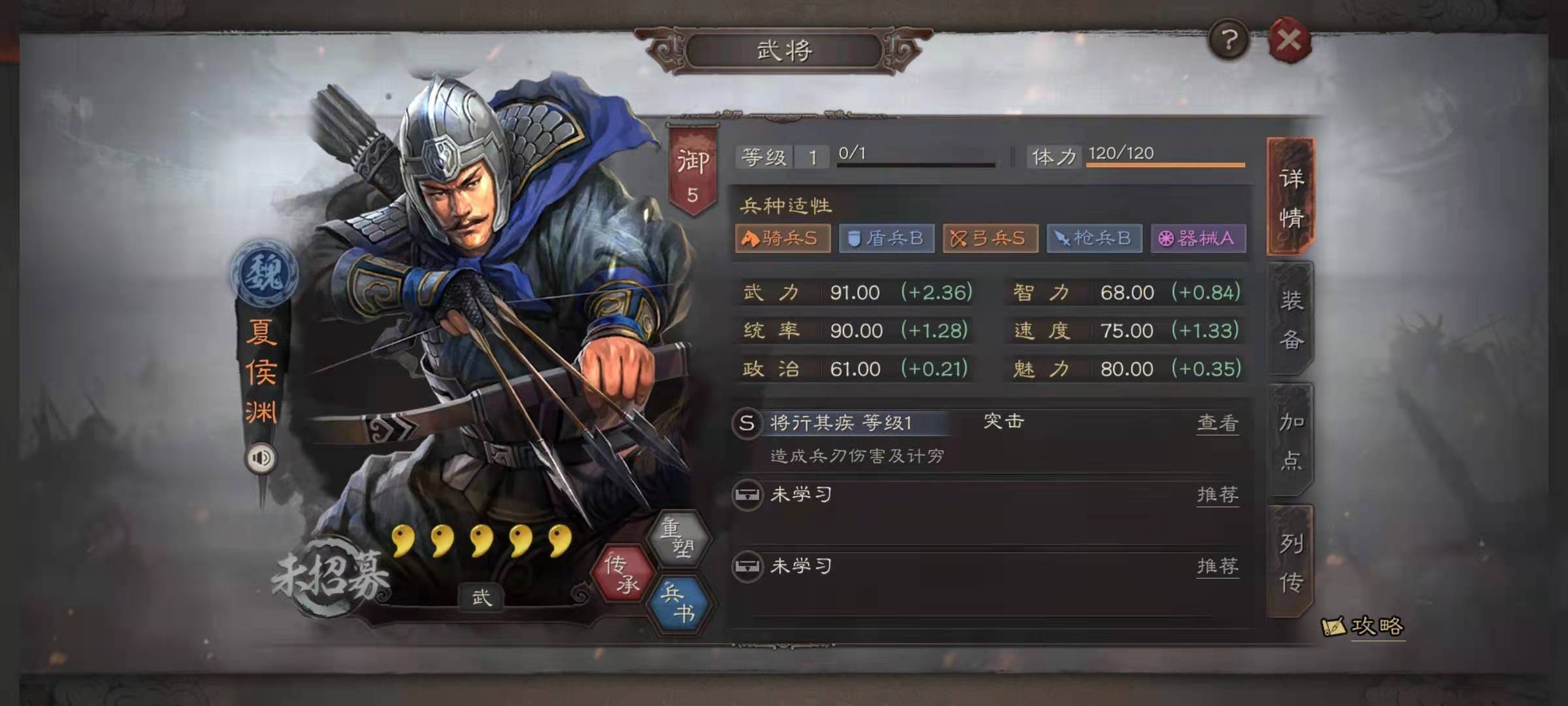夏侯渊属于骑兵和弓兵双S武将,自带战法是将行其疾,效果是在进行一次普通攻击之后,可以随机选择一名敌方武将再打出一次伤害,如果选择的是敌方的主将的话,则可以附带技穷效果。技穷使得目标无法使用主动战法,对于己方而言就是降低了兵力的损耗。太史慈的属于骑兵和弓兵双S的武将,自带的战法是神射,可以使得自身进入连击状态,普攻伤害翻倍,并且降低对方的统率值,太史慈的高输出在拿地方面非常有用。