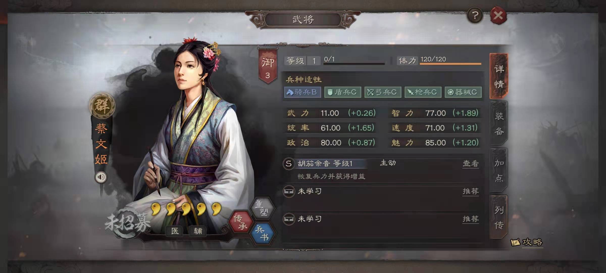 关银屏是骑兵和枪兵的双S武将,自带战法是将门虎女,效果是伤害敌方群体武将,造成兵刃伤害,并且能附加虎嗔效果,可以在下个回合额外造成对目标的伤害,关银屏在开荒中的作用要比关羽还要大。蔡文姬是自身的兵种属性比较差,不过技能确实非常给力,胡笳余音的效果是治疗己方两名武将,在治疗量方面是数一数二的技能,而且还能降低治疗目标受到的伤害。