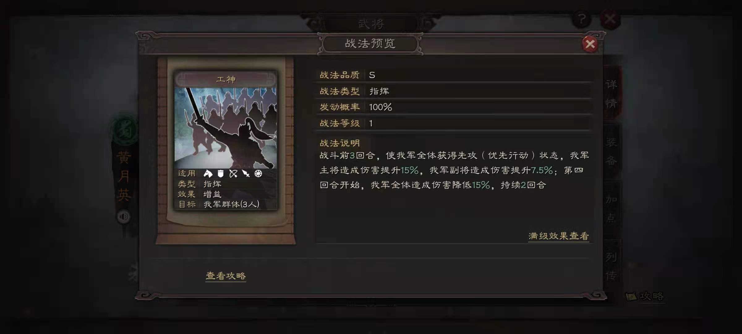 黄月英也是辅助武将,自带的战法是使得己方武将获得先攻状态,可以抢先出手,然后就是造成的伤害提高。这样的两套阵容,除了辅助的蔡文姬和黄月英外,其他的都有两个橙色兵种,这样可以根据对方的兵种快速切换,适用于各种情况,两名武将输出,一名武将辅助,已经足够前期开荒了。