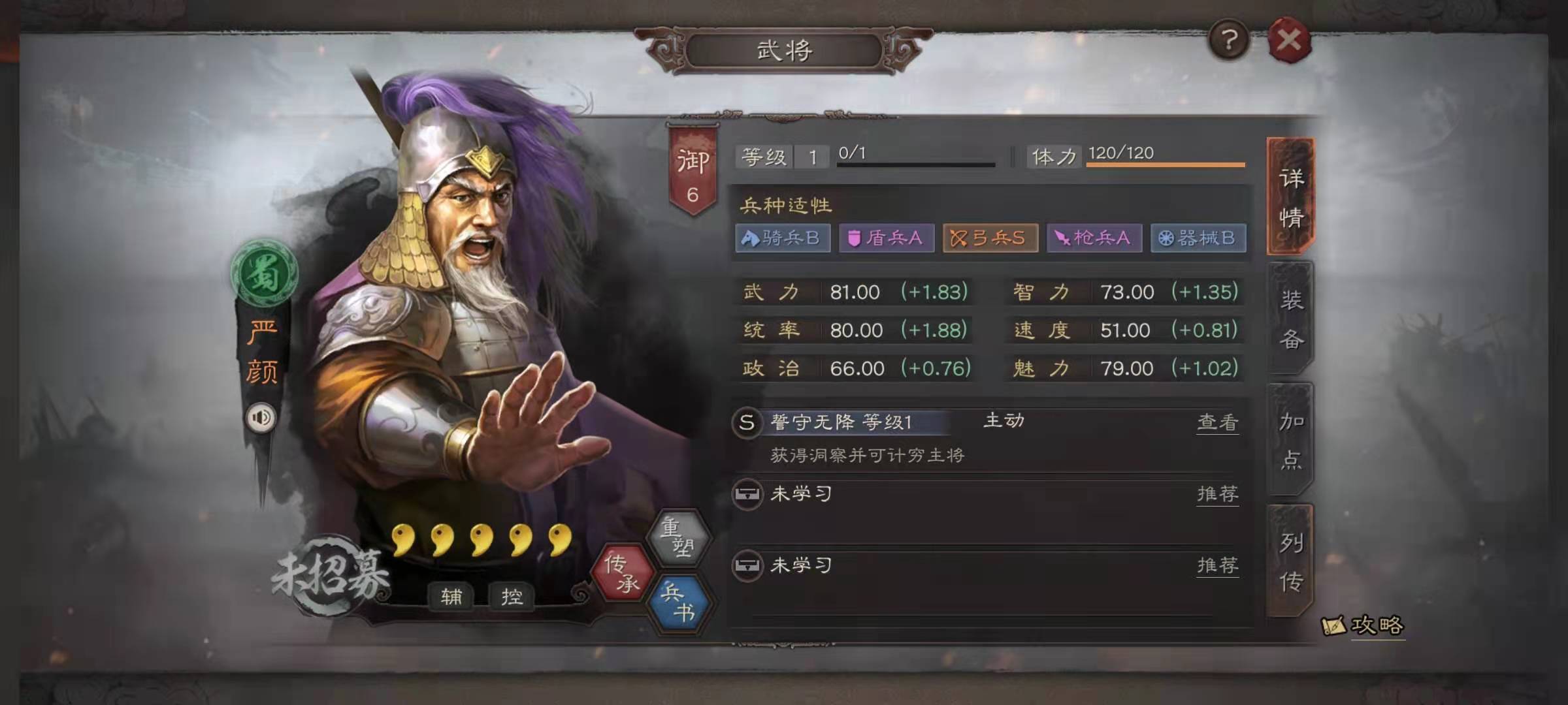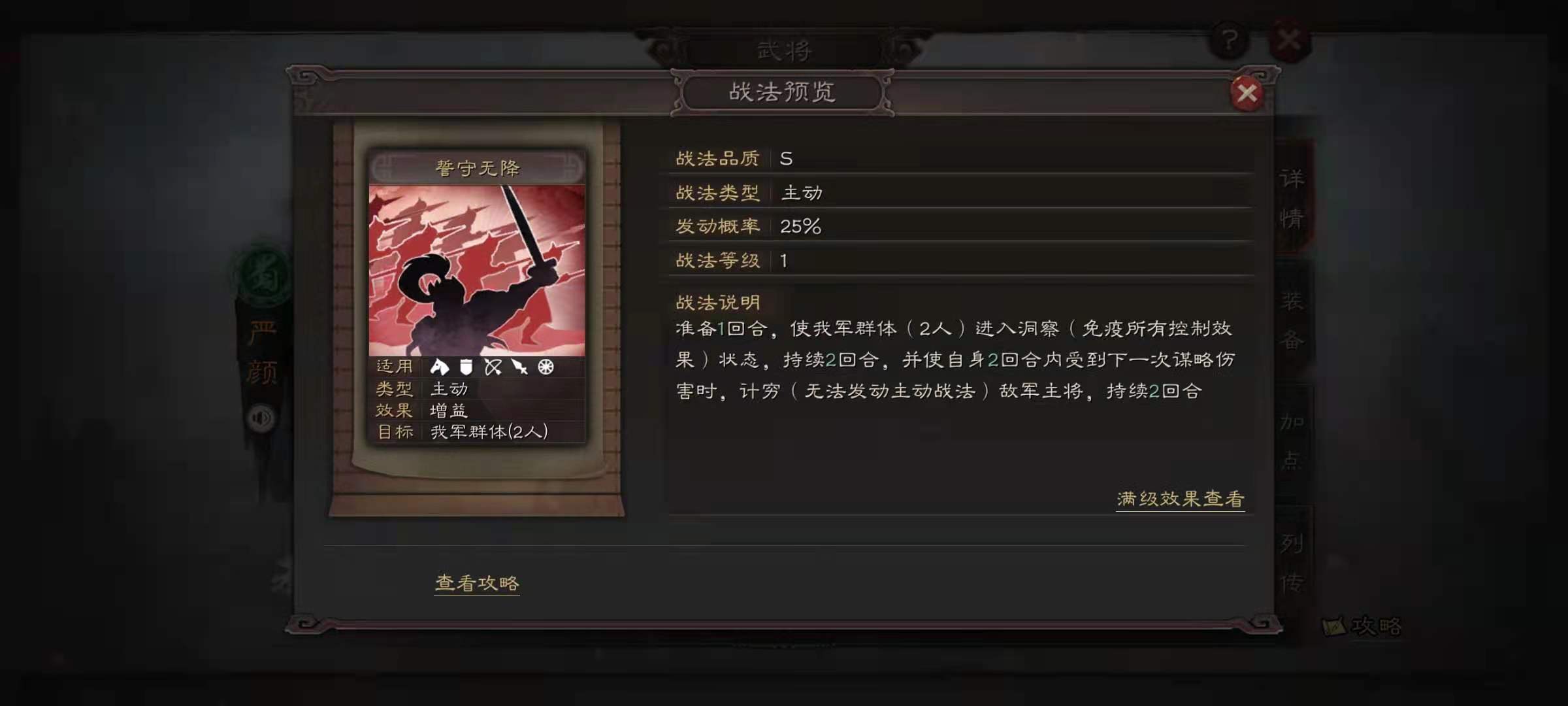 严颜的自带战法誓守无降,效果是准备一个回合,使得己方两名武将进入到洞察状态,并且在自身受到谋略伤害的时候,可以技穷对方的主将。严颜的辅助能力很高,不仅有技穷效果,对于关羽和张飞的洞察状态也能帮助输出。