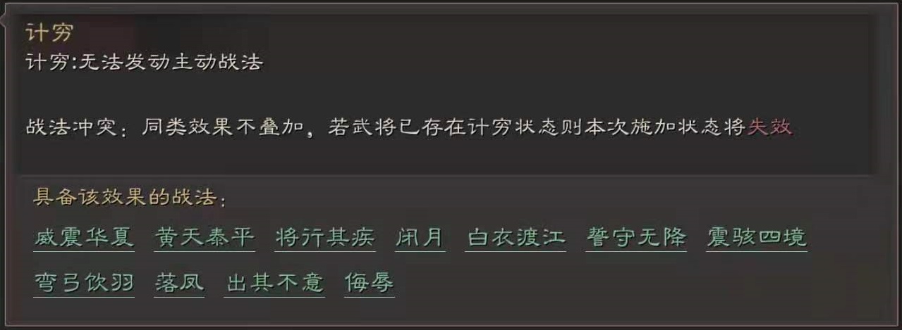 技穷的效果是使得中了状态的敌方武将无法使用主动类型的战法,无法使用战法就意味着只能依靠普攻和被动技能来造成输出,自然输出能力就会受到很大的限制。而技穷队的特点组成的武将都具有或是大部分具有技穷的技能效果,这样在战斗中就可以尽量实现技穷状态的全覆盖,如果是这样的话,对方就是有再高的伤害,也只能是憋在肚子里了。
