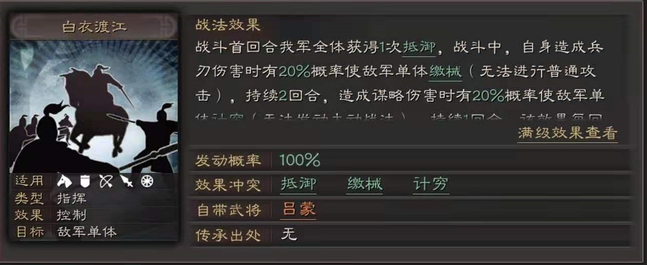 所以综合一下,还是选择枪兵为这一套阵容的兵种,都是蜀国武将也能享受阵营加成,其中关羽的自带战法威震华夏效果是在准备一回合之后,对全体敌方武将造成一次兵刃伤害,使得伤害目标有几率进入到缴械或是技穷状态,并且自身造成的兵刃伤害提升。关羽不仅是爆发伤害的武将,控制上也是一把好手。张飞的自带战法燕人咆哮虽然没有技穷效果,不过张飞的搭配战法落凤和盛气凌敌,一个是造成技穷,一个是造成缴械,也算是具有技穷效果了。