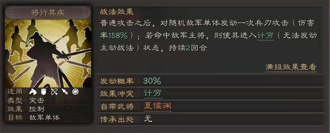 在三国志战略版中,具有技穷效果的战法有威震华夏,黄天太平,将行其疾,闭月,白衣渡江,誓守无降,震骇四境,弯弓饮羽,落凤,出其不意和侮辱等。结合这些战法,以及具有这些战法的武将和搭配战法,以及阵营上的考虑,小编选择的是关羽,张飞,严颜的组合。这一套组合中,关羽的骑兵是S,盾兵是A,枪兵是S,张飞的骑兵是A,盾兵是S,枪兵是S,严颜的弓兵是S,枪兵是A。
