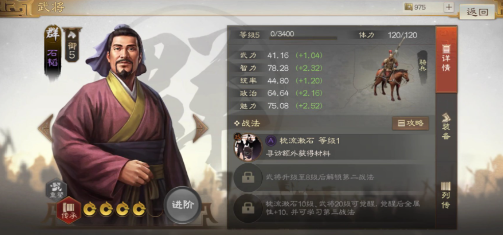 王允这个角色在群雄中是一个五星的盾兵,他的属性中能看出来,他并不是一个上阵杀敌的武将,他的政治以及魅力值都非常的高,由此可见他适合作为一个内政官使用,三国志战棋...[详情]