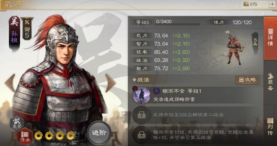 三国的名人一个接着一个,最近的三国游戏中,我们也可以养成这些武将参与战斗,孙桓还是挺有名气,虽然他比不上那些五星武将,但是四星中也是很受欢迎的,属性值不错,三国...[详情]