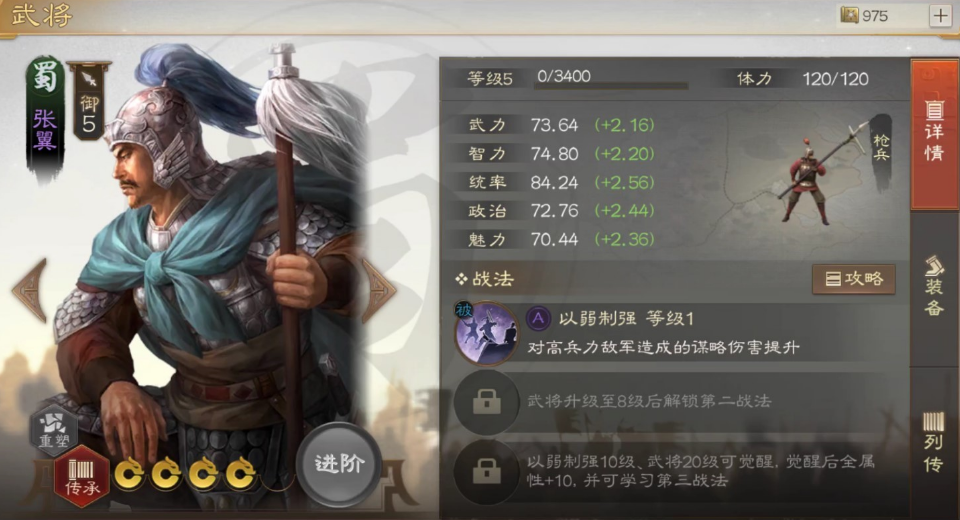 张翼在三国的历史上属于蜀国将领,实力一直很不错,不过在游戏内,这个武将却有些一般了,从定位上看的话他是一个四星紫将,基础属性偏低,很多玩家在获取这个武将之后不知...[详情]