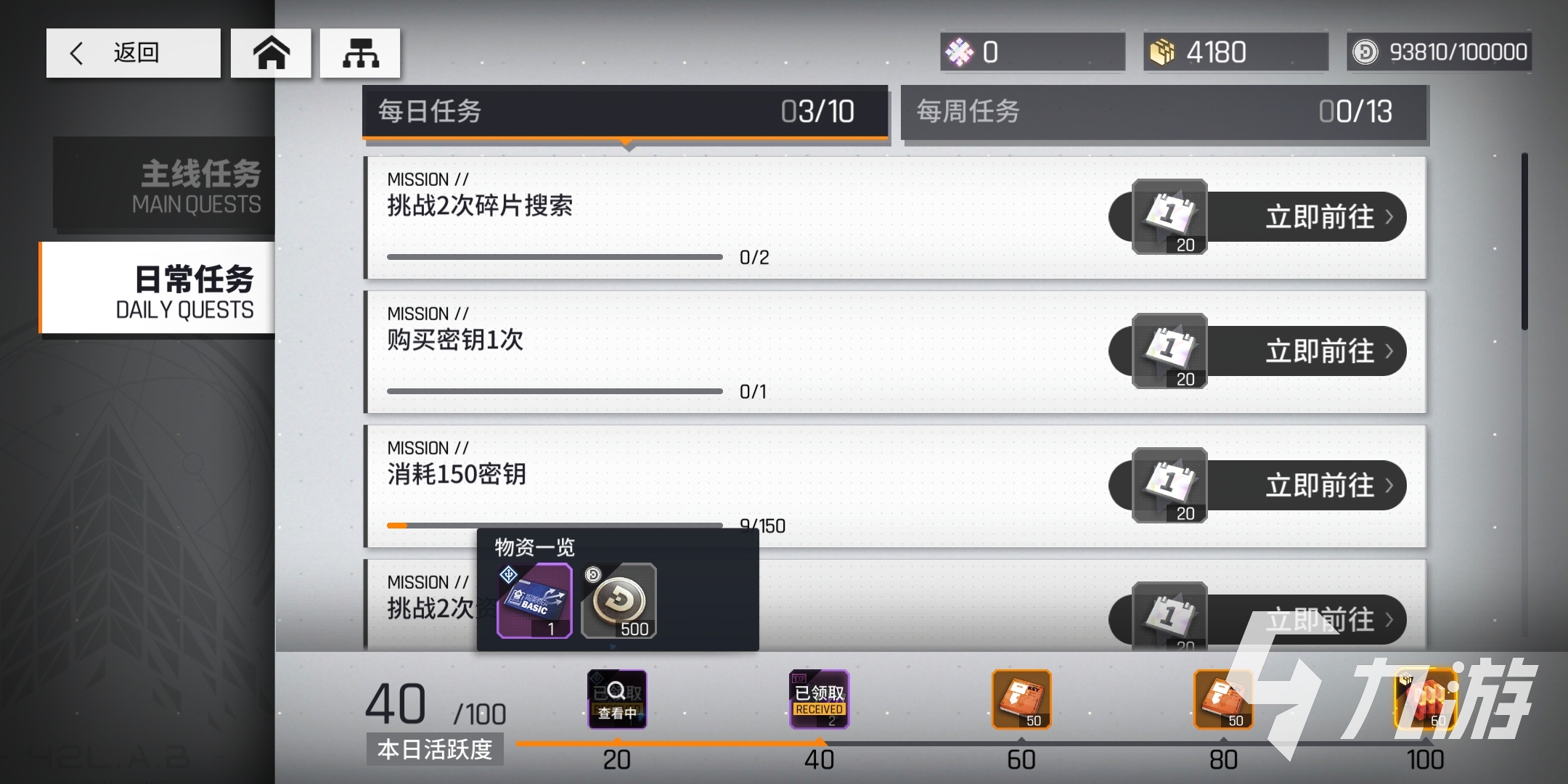 每日任务除了有任务奖励之外,玩家完成的任务越多,活跃度也就越高,当活跃度达到20的时候,玩家可以领取活跃度奖励基础检索指令,只要完成活跃度条件,每天都可以在这里领取一张基础检索指令。