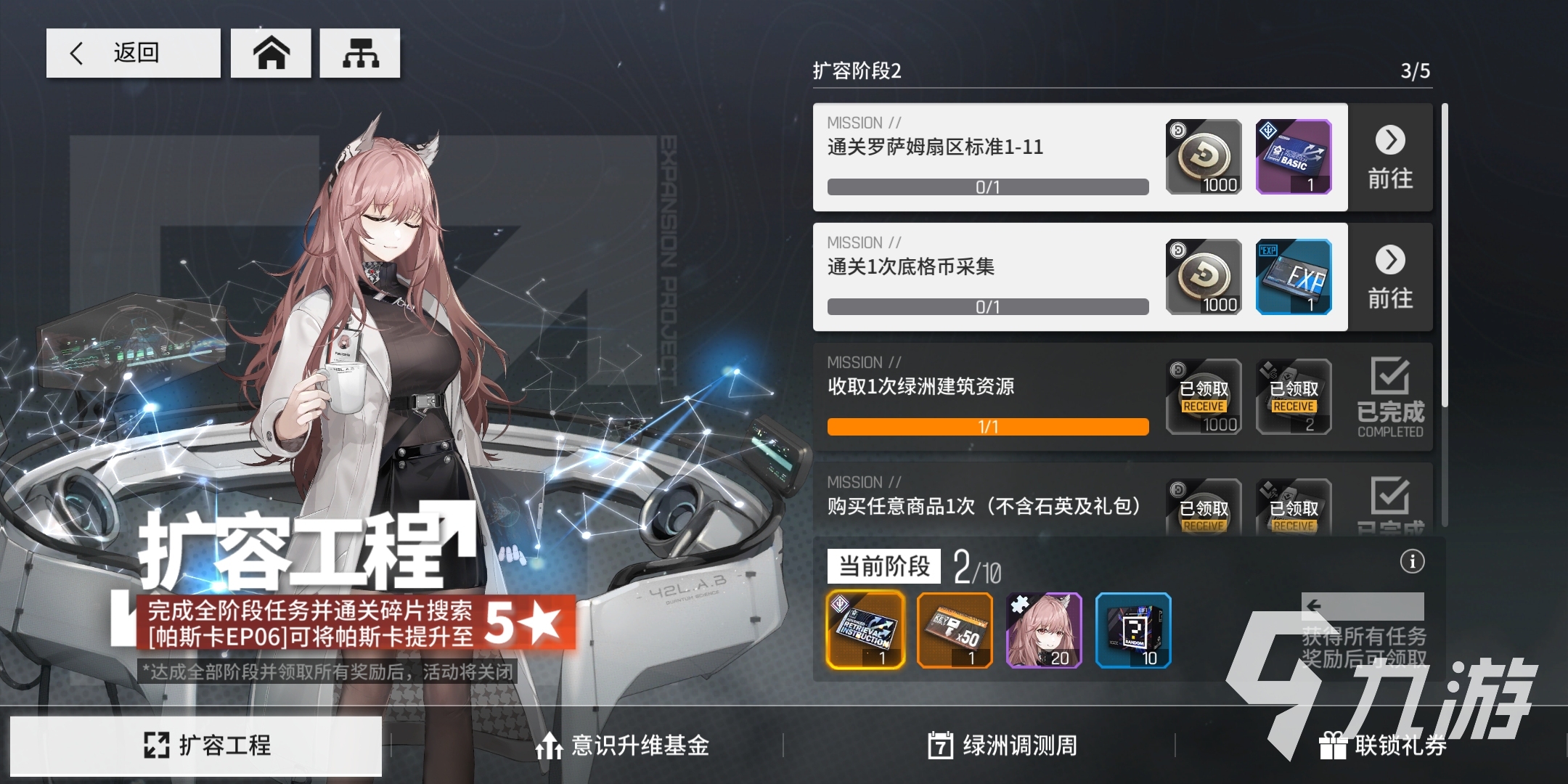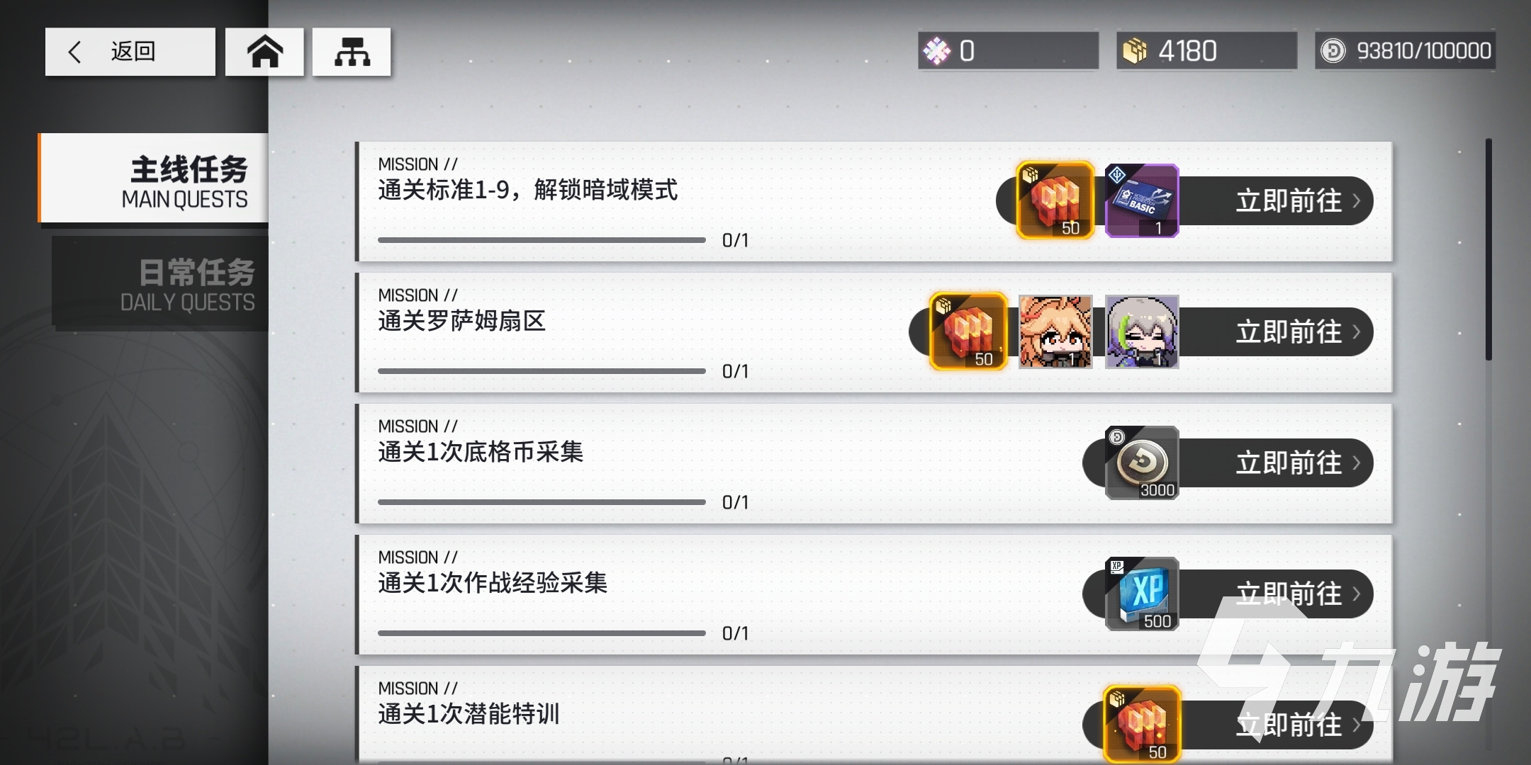 主线任务的奖励有很多,根据任务的难度来发放不同的奖励,当玩家通关1-9的时候,在主线任务这一栏中,能够得到一张基础检索指令。除此之外,将检索指令升级到2级,完成主线任务,可以得到5张基础检索指令。