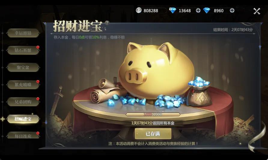 赚到专属钻石后,我们可以放招财进宝,每100钻石每日返10钻石,最多存1000钻石