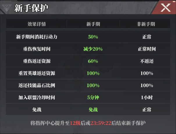 7.巧用新手保护机制:新手保护机制的时间为24小时(或指挥中心升到12级)在此期间优先发展基建和英雄战力,积蓄足够的战力和基础物资后发展防御工事性价比更高。