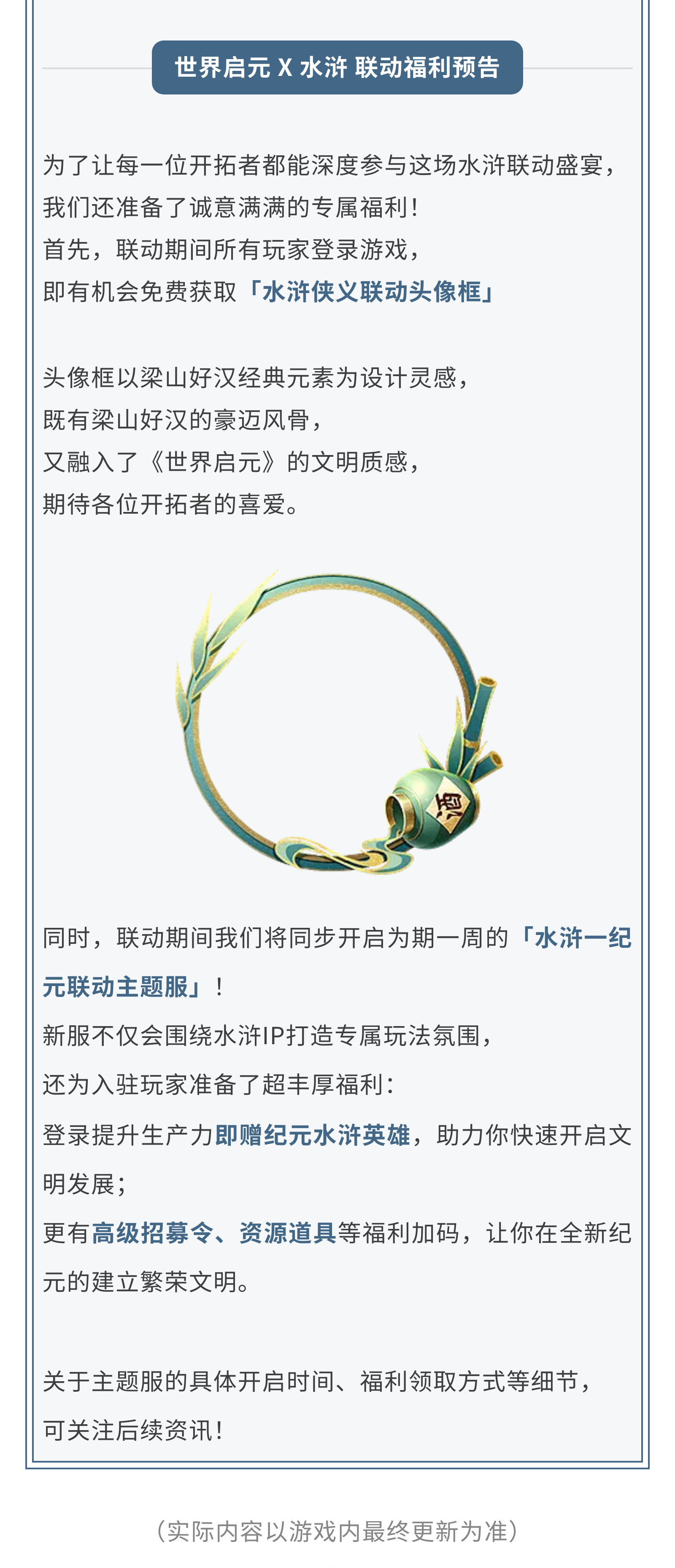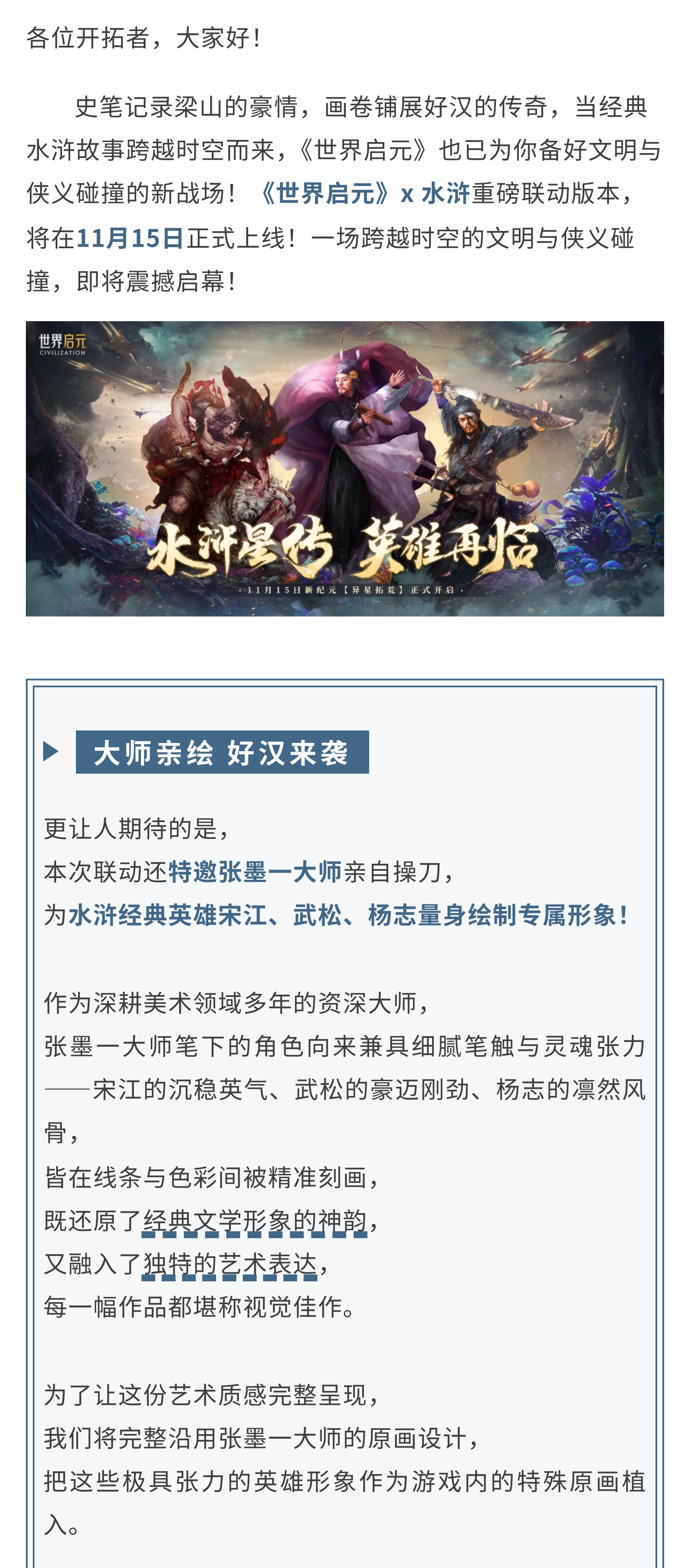 手机游戏> 世界启元手游> 游戏新闻> 世界启元 X 水浒联动版本定档11月15日!