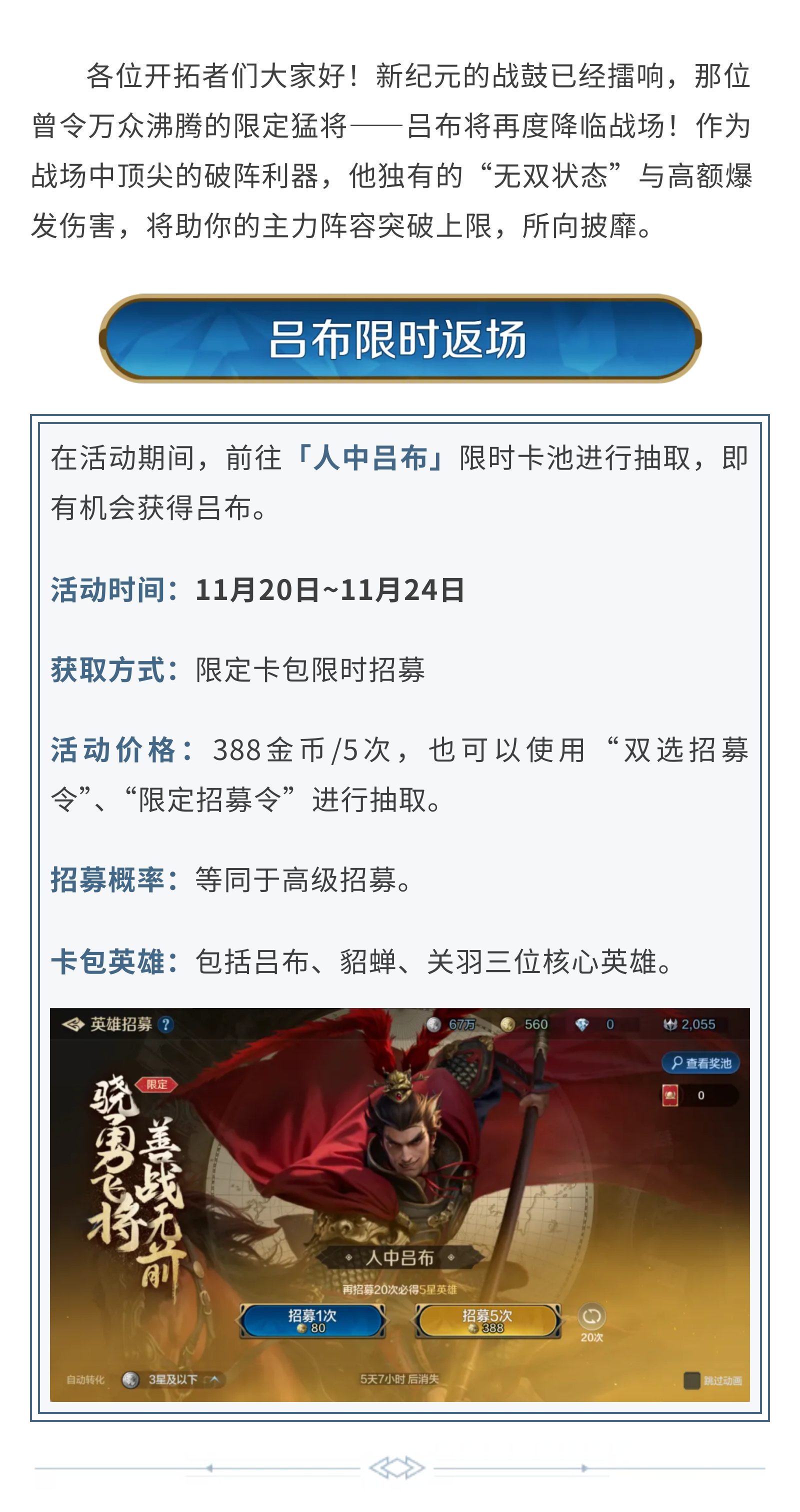 新活动资讯丨无双战神猛将降临限定英雄吕布返场