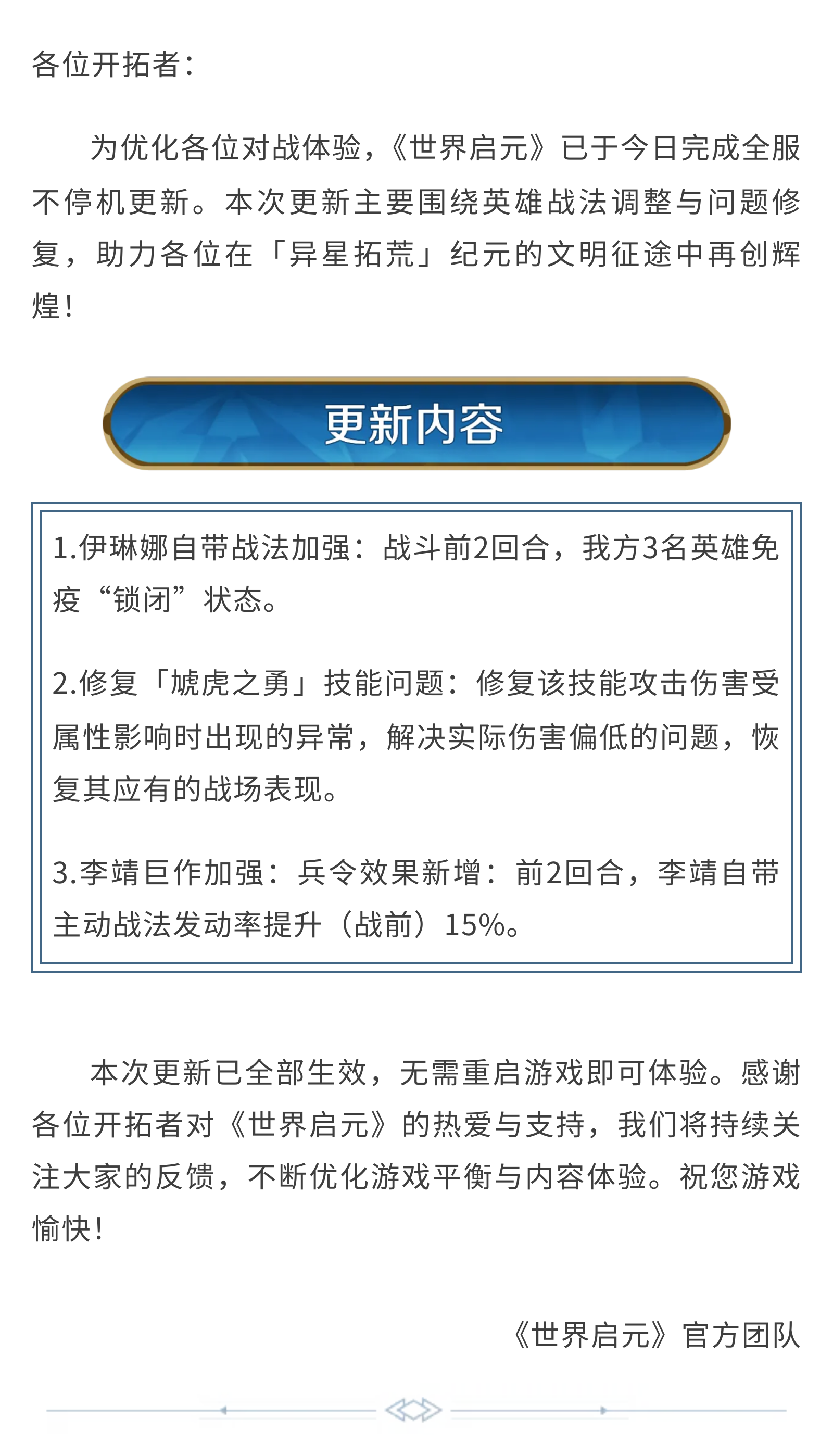 手机游戏> 世界启元手游> 游戏新闻> 伊琳娜加强 虓虎之勇问题修复