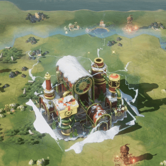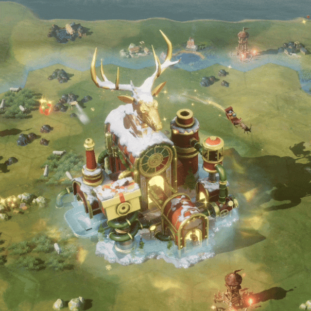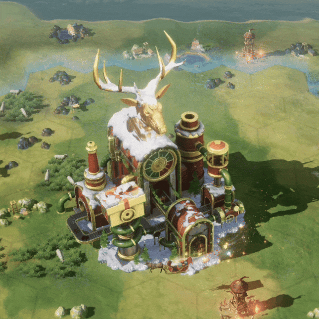 白雪皑皑下,齿轮轰鸣中,有座工厂持续生产礼物,在门前取货的麋鹿络绎不绝,为世界带来希望。隐约看见那工厂上,有座闪着金光的鹿头雕像,似乎在宣告美好的到来……