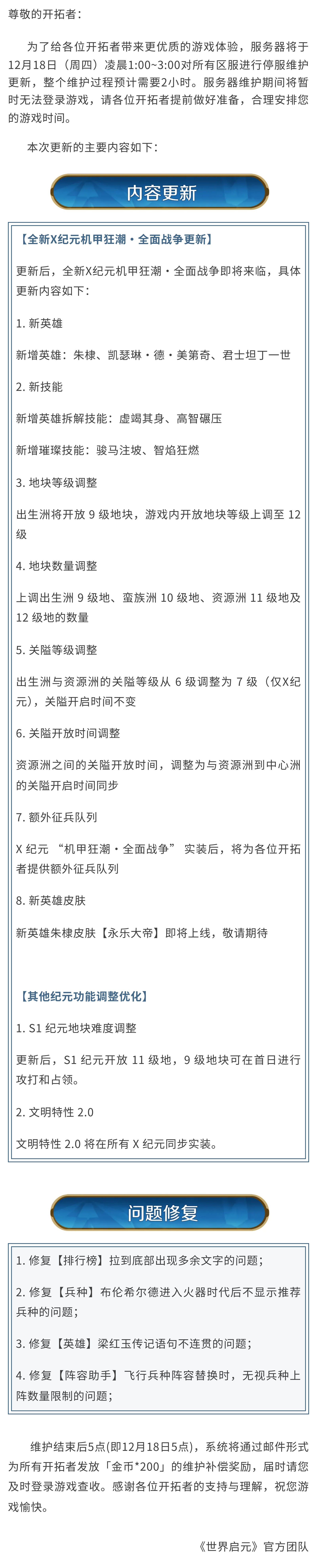 《世界启元》12月18日更新公告