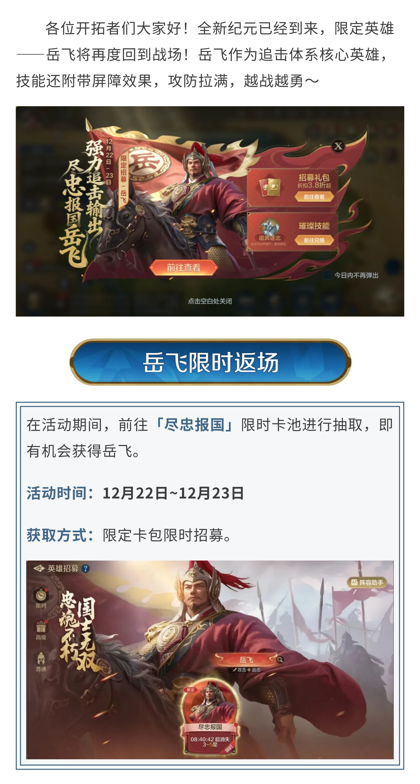 - 新纪元情报丨岳飞返场!全新璀璨技能同步登场!
