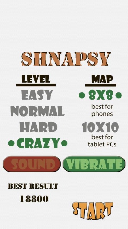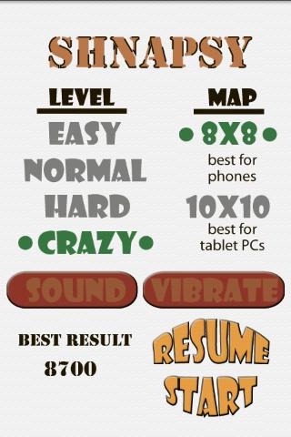 Do you like matching games? Shnapsy is a classic match 3 game. Fun, addictive and free!Touch the boundary chips to move them.Collect three or more matching chips in a row to destroy.Four levels of difficulty in this game are available: easy, normal and hard - for those who prefer to think things through calmly, crazy - for those who believe in luck.You can use large and all maps in this match 3 for different screens of devices. 8 x 8 is best for phones, 10 x 10 is best for tablet PC's, but you can use any of them.Best of free matching games!Download this match 3 game! Play ShnaPsy match3 - one of best free matching games!
