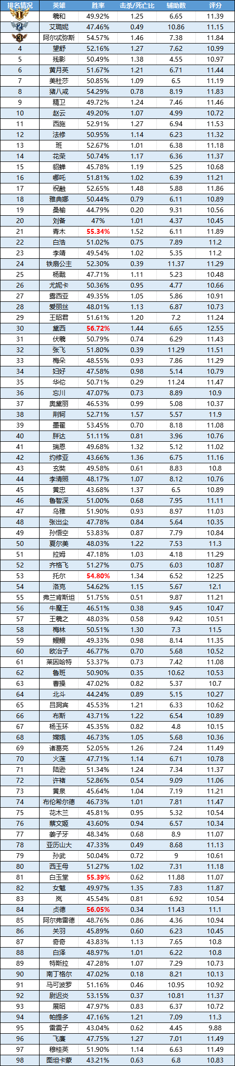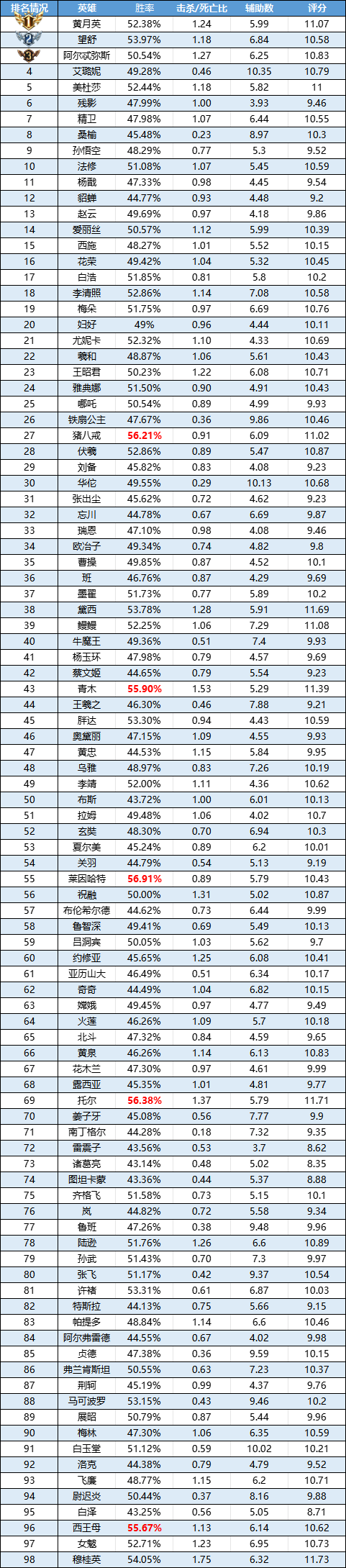 排序:榜单按出场率由高到低排序,标红胜率前5。