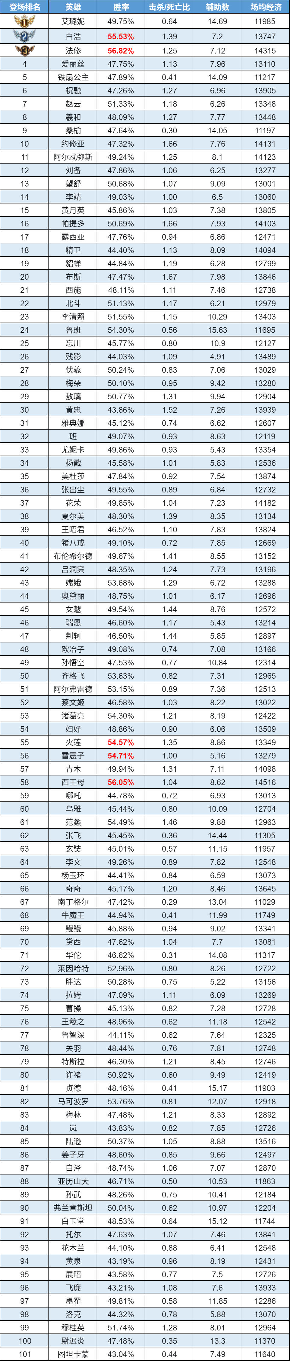 排序:按登场率高低排序,标红为胜率前5
