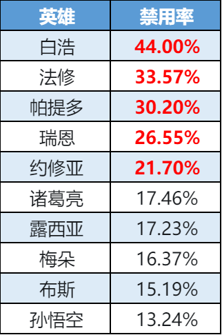 禁用率榜-白浩强势登顶,帕提多排名持续攀升