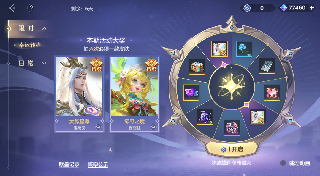 使用龙晶或完成任务获取幸运币,进行抽奖。诸葛亮·太微星尊、爱丽丝·绿野之境、击败特效自选箱、比心表情、龙魂祈福卡、皮肤碎片、改名卡等奖励等你来抽!最多6抽获得1款皮肤,最多9抽获得全部奖励,前2抽抽到皮肤的守护者会获得欧皇称号。