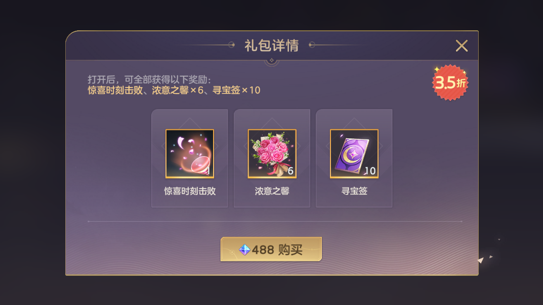 惊喜跃动礼包限时售卖,礼包奖励包含惊喜时刻击败、浓意之馨*6、寻宝签*10。