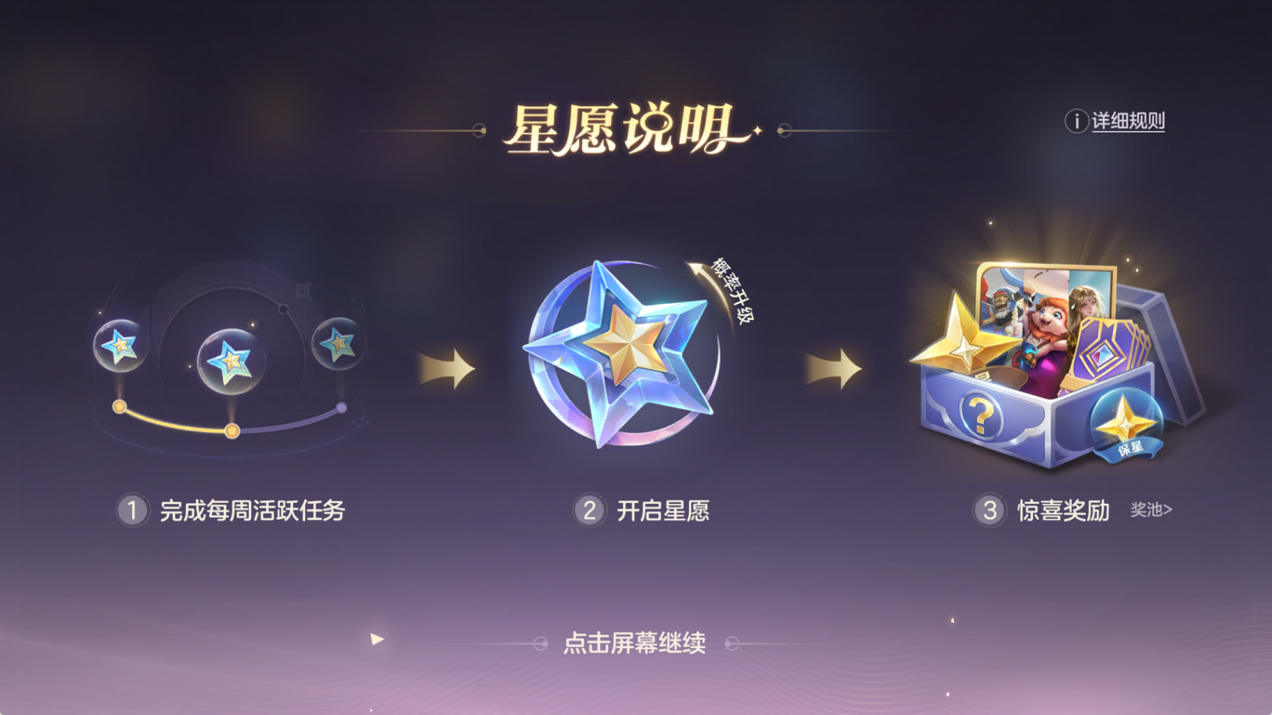 2)新增全新奖励:星愿,每颗星愿有多次免费的品质升级机会,升级后可获得更高级别的奖励(皮肤、礼券等)