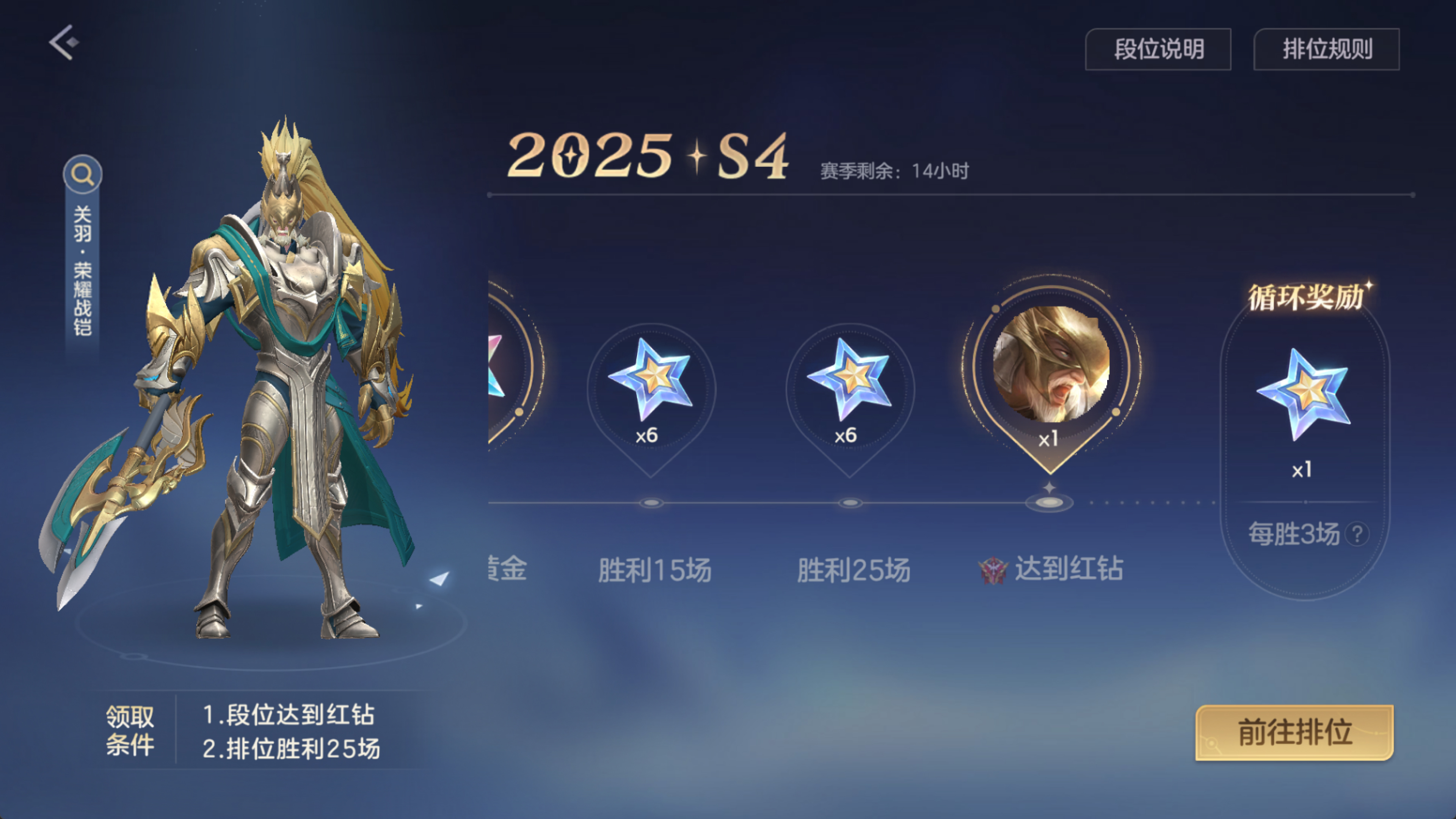 2)新赛季排位胜利25场并达到红钻段位,即可免费领取全新史诗关羽·荣耀战铠