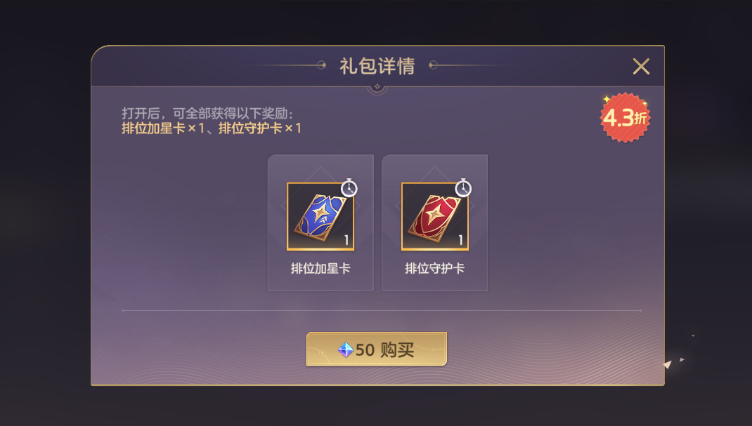 新赛季排位礼包限时开售,礼包奖励包含排位加星卡*1、排位守护卡*1。