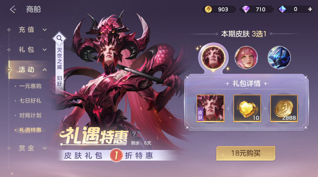 礼遇皮肤礼包限时1折,妇好·灭世之威、桑榆·野餐时光、刘备·破界指令超值3选1获得。