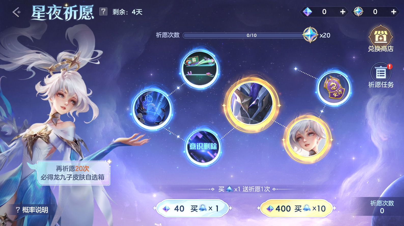 祈愿可累积幸运值,满幸运值时可获得大量银辉晶石,即可兑换天工皮肤残影·斩妖御魔行、美杜莎·末日邪眼、刘备·崩坏之源等奖励。