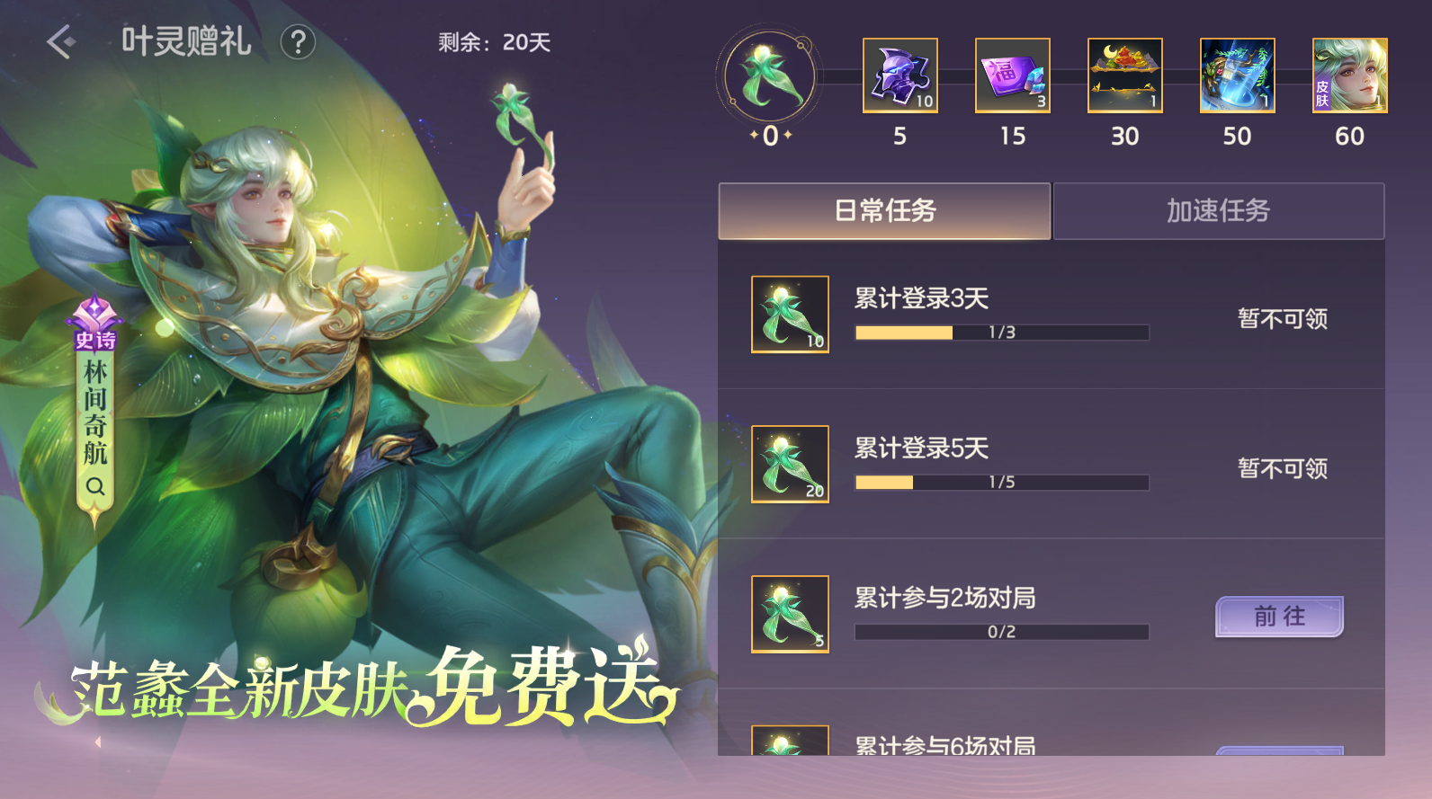 全新史诗皮肤【范蠡·林间奇航】,免费领取!完成任务获取叶灵,即可领取阶段奖励。更有空山幽月播报、张灯结彩回城、范蠡·林间奇航等你来领!