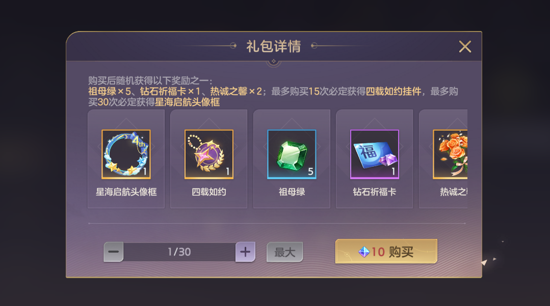 周年福袋限时开售!购买可随机获得星海启航头像框、四载如约挂件、祖母绿、钻石祈福卡、热诚之馨,最多15抽必得四载如约挂件,最多30抽必得星海启航头像框。