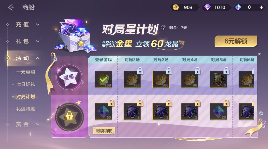 完成对局任务,提升等级免费获取英雄碎片、金币;付费6元解锁金星可获得龙晶*120、龙魂祈福卡、皮肤碎片。