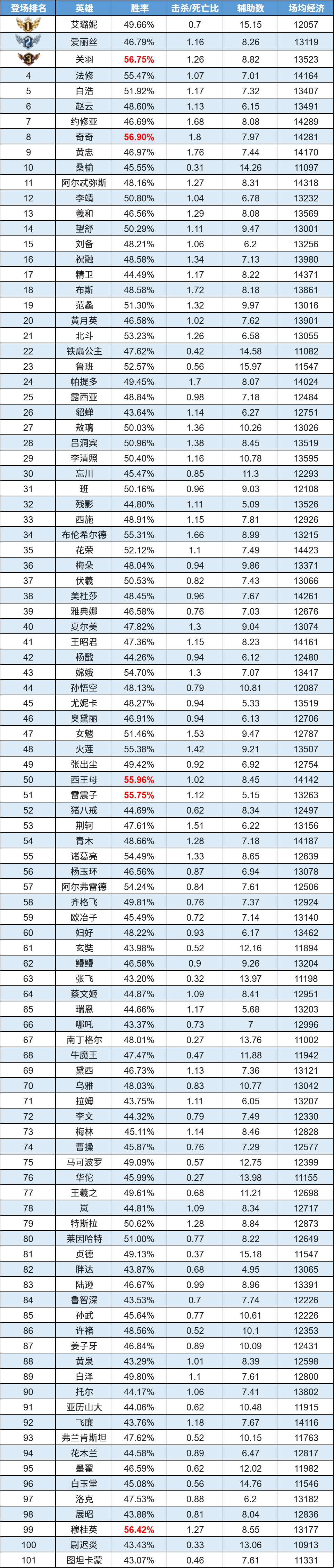 手机游戏> 曙光英雄> 游戏新闻> 趣味数据|关羽登ban位之巅 飞廉低段理财第一