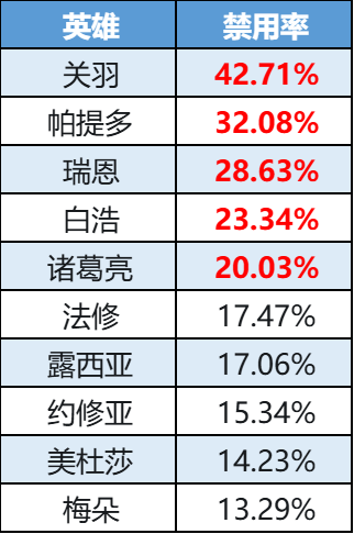 禁用率榜-关羽冲上榜一,瑞恩排名上升