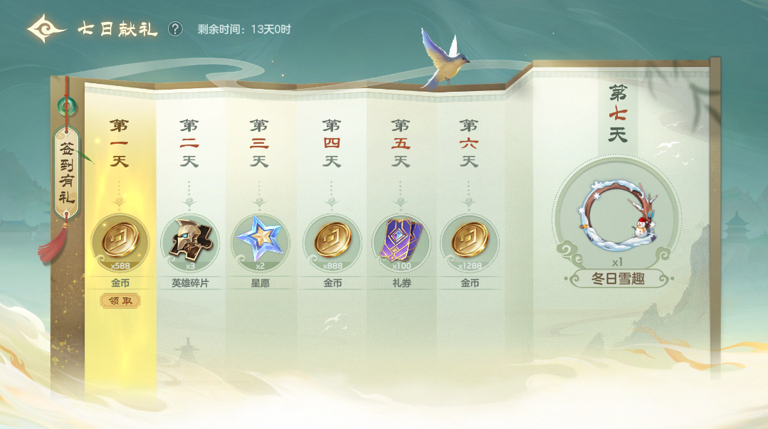 每日登录游戏即可领取冬日雪趣头像框、礼券、星愿、英雄碎片等奖励。