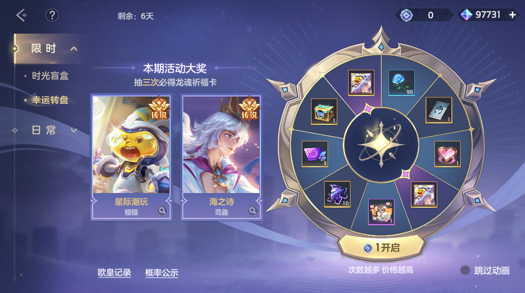 使用龙晶购买幸运币进行抽奖。鳗鳗·星际潮玩、范蠡·海之诗、回城特效自选箱、下饭表情、龙魂祈福卡、皮肤碎片、好感度礼包、改名卡等奖励等你来抽!最多3抽获得龙魂祈福卡,最多6抽获得1款皮肤,最多9抽可获得全部奖励,前2抽抽到皮肤的守护者会获得欧皇称号。